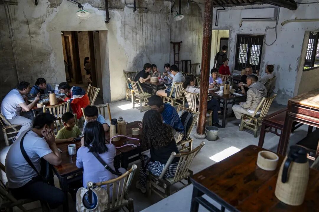 小西街的湖州老茶館藏著古城生活密碼。館內(nèi)茶香氤氳,老茶客圍坐閑談,臺上《朝奉吃菜》的戲曲正酣,一顰一笑間盡是市井情趣,在絲竹聲中觸摸到湖州作為江南商埠的繁華余溫。
